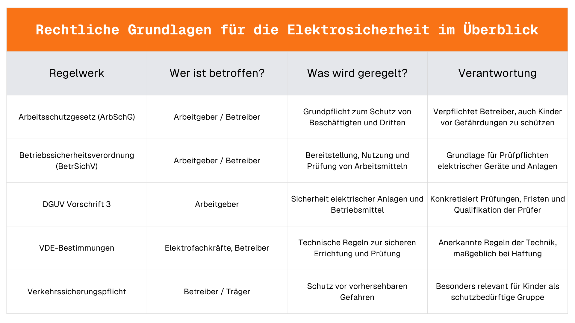 Unabhängig von der konkreten Norm gilt: Elektrische Anlagen und Betriebsmittel müssen sicher errichtet, regelmäßig geprüft und ordnungsgemäß betrieben werden. Maßgeblich ist dabei nicht nur der bestimmungsgemäße Gebrauch, sondern auch vorhersehbares Fehlverhalten – insbesondere bei Kindern.